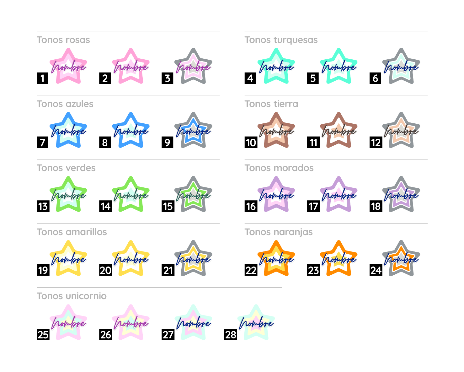 | Personalización | Nombre y colores |
