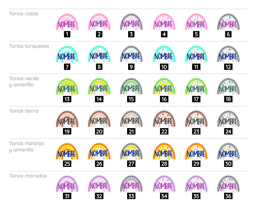 Tus colores favoritos: Sabemos que cada habitación tiene su propio estilo. Por eso, puedes elegir entre nuestra amplia gama de tonalidades (desde pasteles suaves hasta colores vibrantes) para personalizar tanto el arcoíris como el nombre.